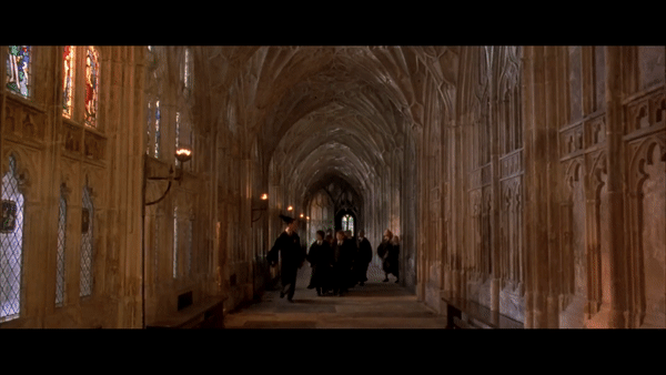-Son conducidos al Gran Comedor por la Profesora McGonagall. Filmaron una toma adicional de ella caminando hacia la cámara. Cuando llegamos a ver el Gran Salón por primera vez en la película, está filmado desde atrás, y la profesora McGonagall y los estudiantes se alejan de la cámara.