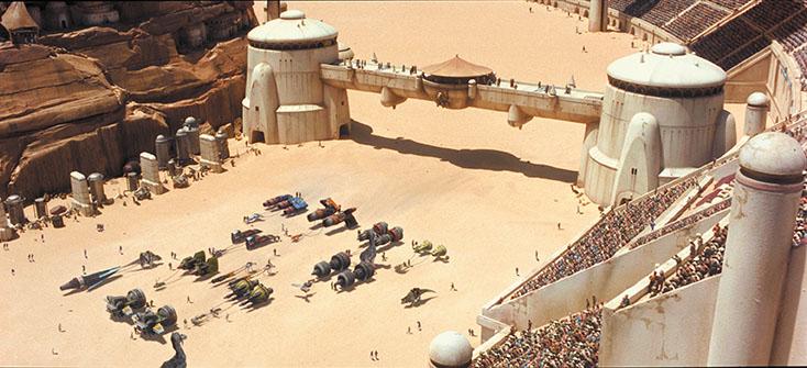Qui-Gon, Jar Jar, R2-D2 y Padme, la doncella de la reina por peticion de esta, visitan el asentamiento de Mos Espa para comprar las piezas para su hiperimpulsor.