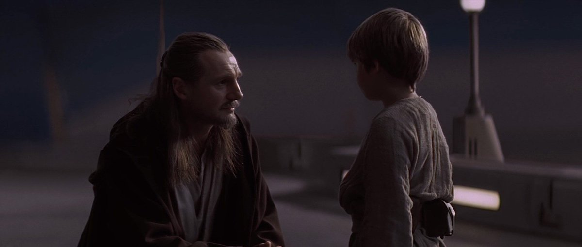 Qui-Gon le explica a la madre de Anakin, Shmi Skywalker, que siente una presencia fuerte de la Fuerza en el niño.