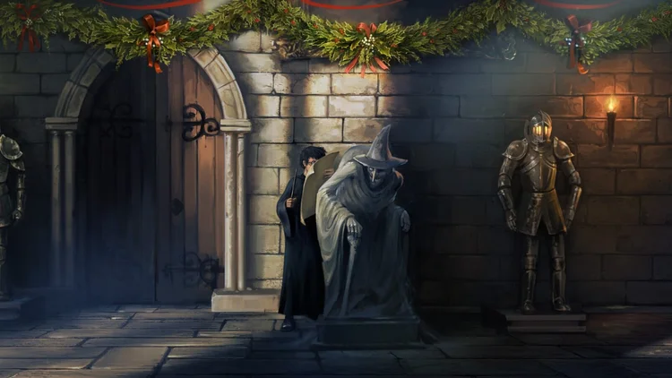 Aquí vemos a Sir Cadogan custodiando la entrada a la Sala Común de Gryffindor. Dean Thomas señala que Sir Cadogan recibió el trabajo debido a que ninguno de los otros retratos lo quería después de lo que le sucedió a la Dama Gorda. Neville dice que la contraseña cambia constantemente, por lo que ha comenzado a anotarlas en una lista.