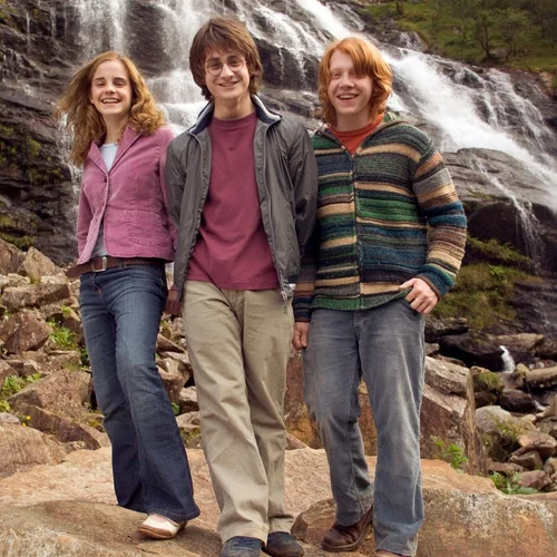 Aquí vemos a Harry, Ron y Hermione parados en la escalera del cobertizo para botes tomados de la mano. Están viendo a los estudiantes de Beauxbatons y Durmstrang salir de Hogwarts. Esta es la última escena de la película, sin embargo, solo vemos esta toma desde atrás.