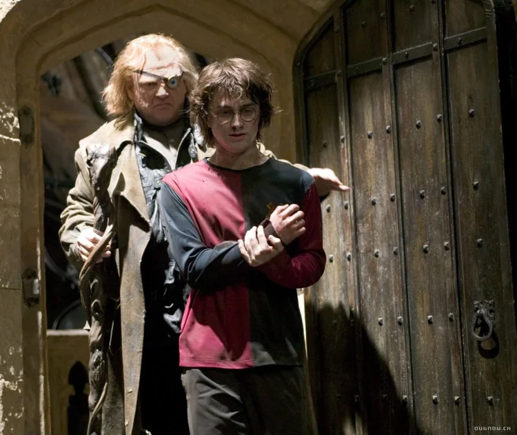 Una toma de Ojoloco Moody entrando al aula de Defensa Contra las Artes Oscuras aparece en el tráiler internacional. En el guión, encontramos que comienza la clase dejando caer el libro de texto en el escritorio de Neville y dice que será un buen tope para la puerta.