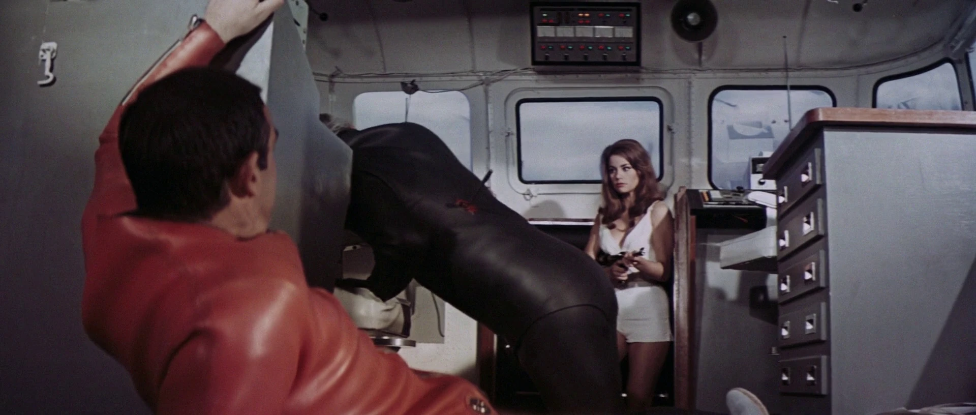 Esta acepta ayudar a Bond usando la cámara submarina para buscar las bombas. Si el contador geiger las detecta, tiene que suvir a cuvierta.